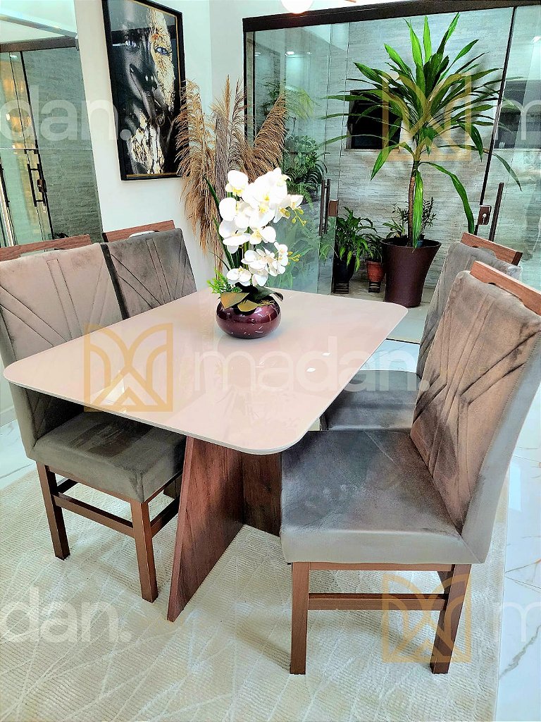 Tampo chanfrado e cantos arredondados, que unem sofisticaçao e leveza. Vidro temperado, sobreposto a madeira inteiramente colado proporcionando segurança e resistencia. Base em MDF formato X com sapatas reguláveis, que oferece excelente sustentaçao e contribui para firmeza e durabilidade do conjunto permitindo encaixe total das cadeiras.
