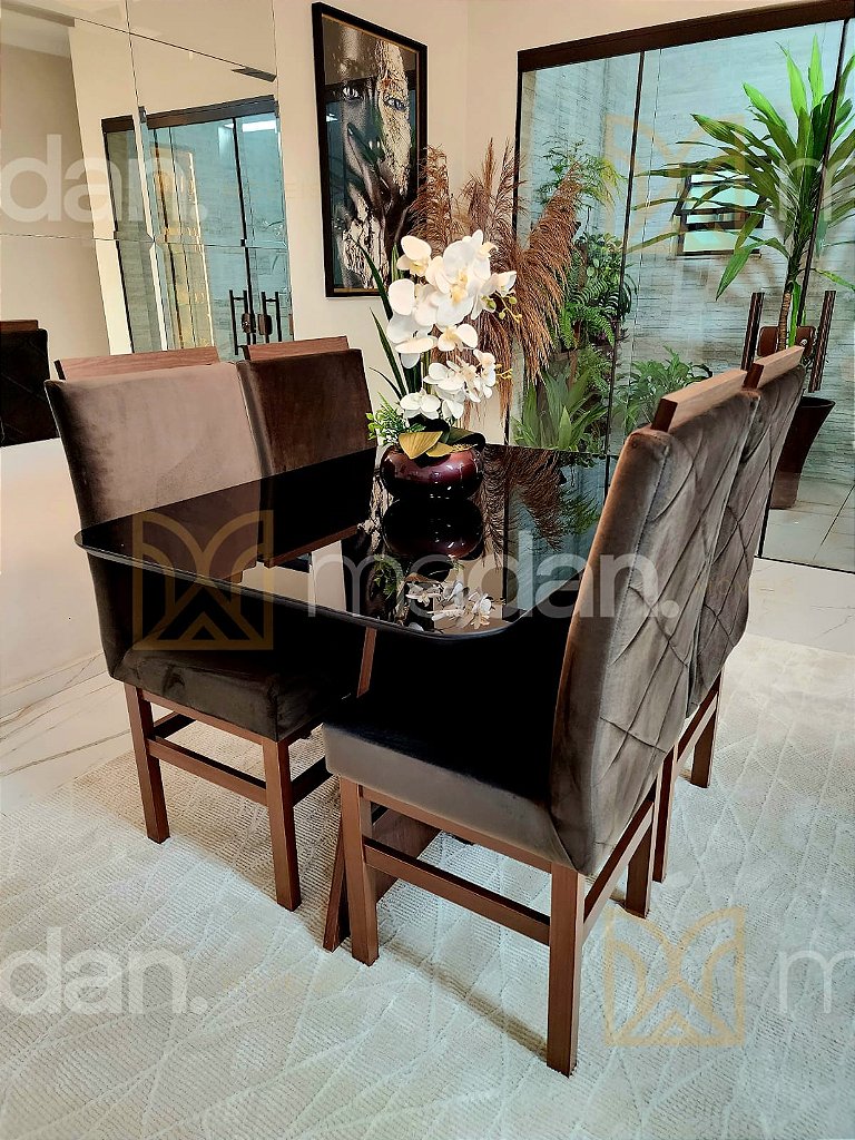 Tampo chanfrado e cantos arredondados, que unem sofisticaçao e leveza. Vidro temperado, sobreposto a madeira inteiramente colado proporcionando segurança e resistencia. Base em MDF formato X com sapatas reguláveis, que oferece excelente sustentaçao e contribui para firmeza e durabilidade do conjunto permitindo encaixe total das cadeiras.